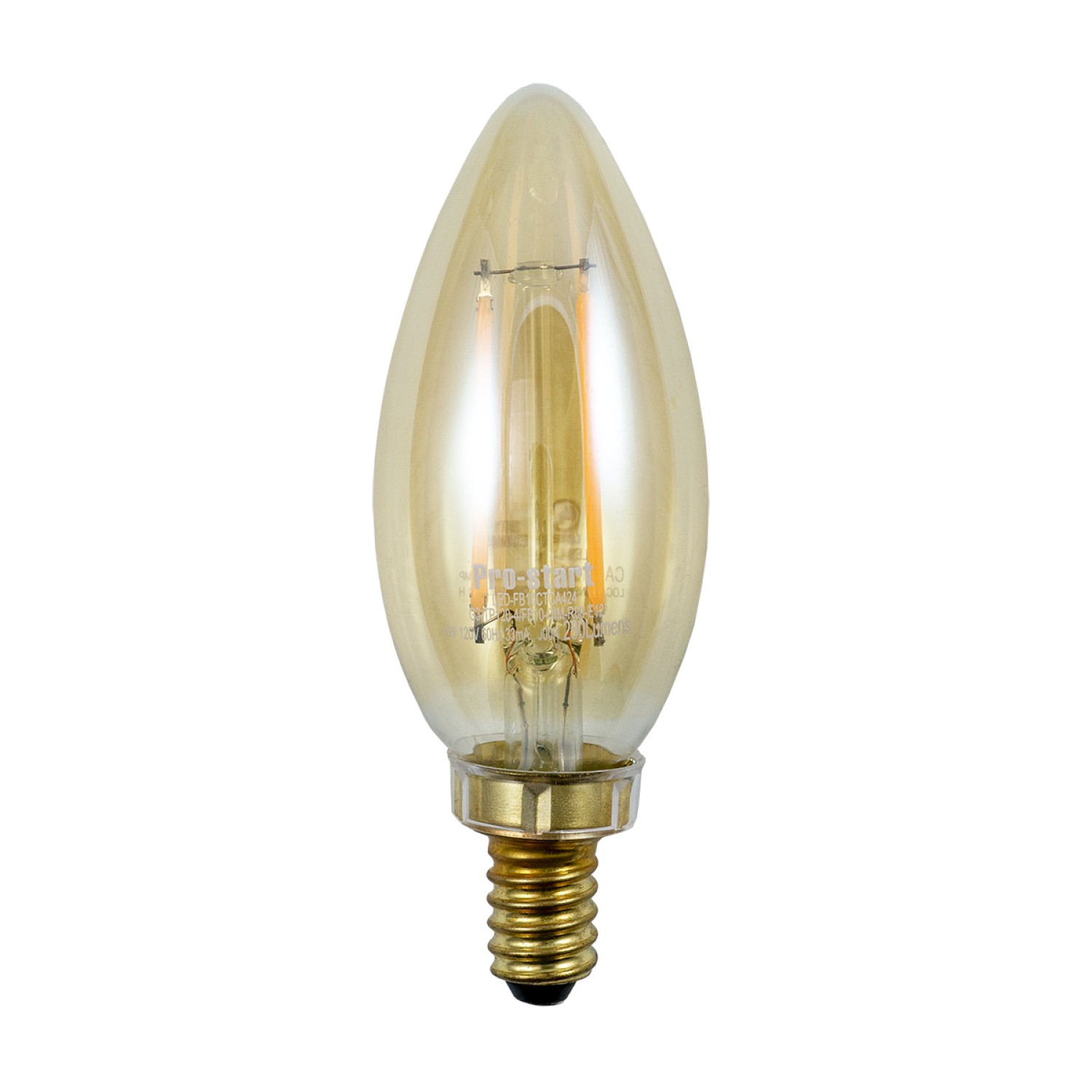 Voltage: 120V, Wattage: 4W, Type: LED B10 Filament Bulb, Color Temp (Kelvin): 2400K, Lumens: 280, Replaces: 40W Incandescent Bulb, Beam Spread: 360 Degree, Lamp Shape: B10 Torpedo-Tip, Base Type: E12 (candelabra screw base), Average Life Hours: 25,000, Case Quantity: Order 10 for a full case, Color Emitted: Warm White, Is It Dimmable?: Yes, Glass: Amber tinted.