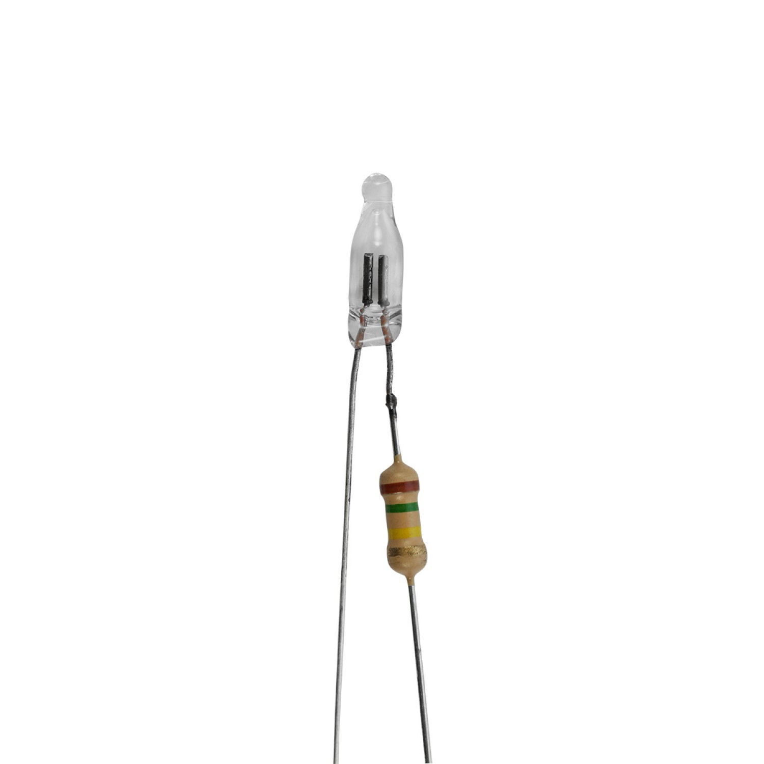 NE-1H Neon Lamp With Attached 150K 0.25W Resistor. 220 Volt Operation, Solder Ready 1.00 in. Leads. 25,000 Life Hours. Glass Diameter: 0.125 in. Glass Length 0.27 in., Neon Orange Glow, 0.25 in. Resistor Spacing From Bottom Of Glass To Top Of The Resistor